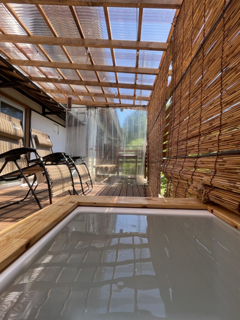 最大12名で利用可能。さらにロウリュウができる本格サウナと遠赤外線のサウナ2種類を設備。サウナ後に直結しているオープンテラスで水風呂に。北アルプスの絶景と自然の澄んだ空気で整うことができ、完全プライベート空間でサウナを楽しむことが出来ます。